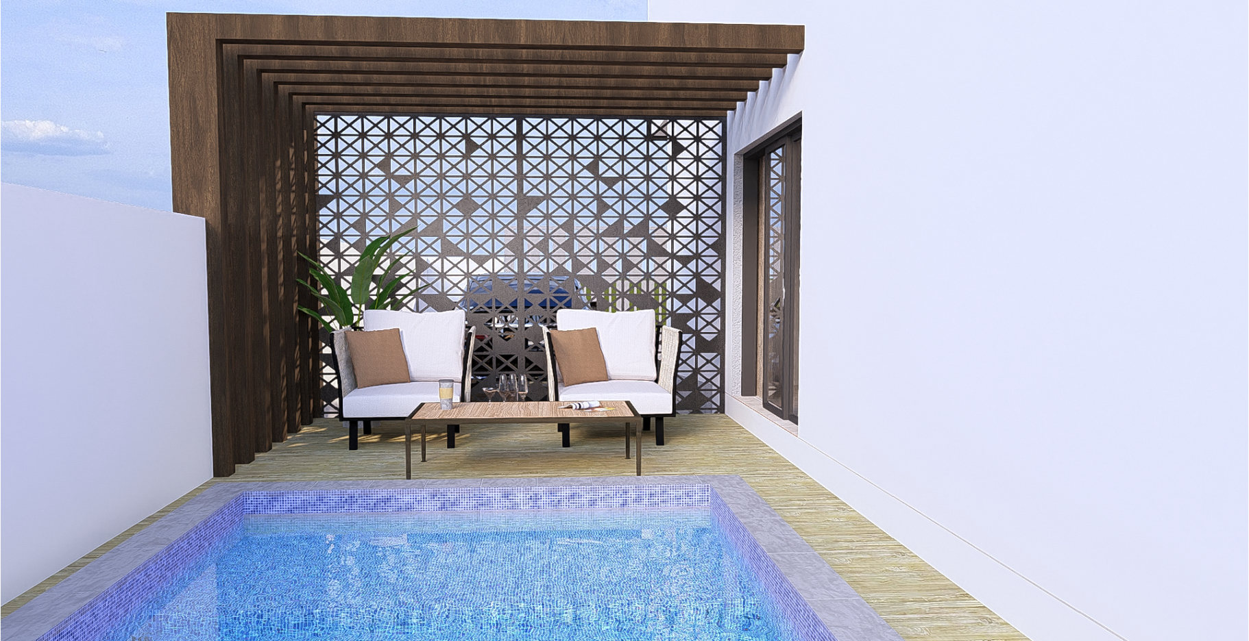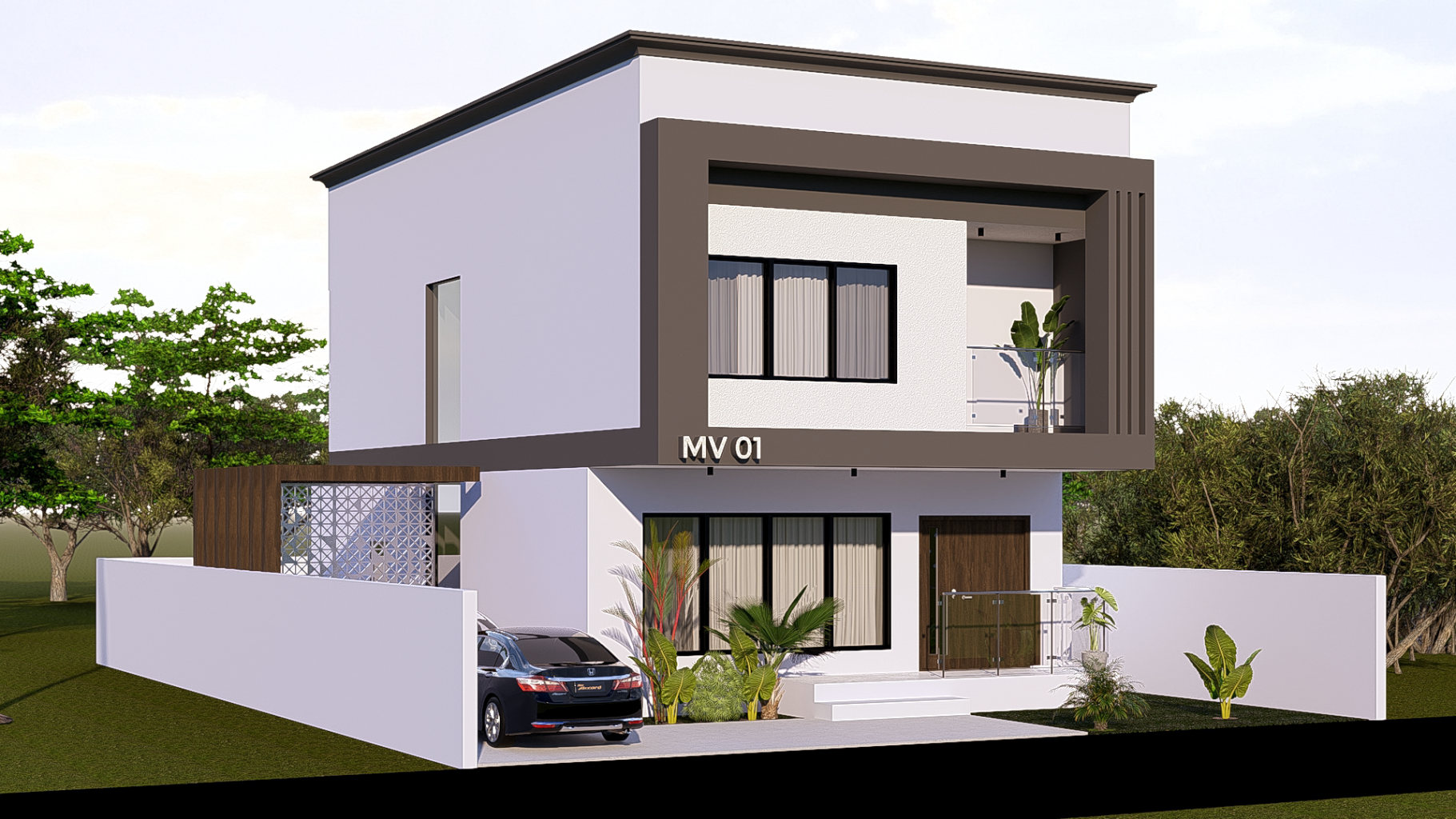 This exquisite villa features a private swimming pool, a stylish balcony with glass railings for privacy, and a spacious hall and dining area. It also includes a welcoming family room for gatherings and a convenient driveway with ample parking, surrounded by lush greenery.