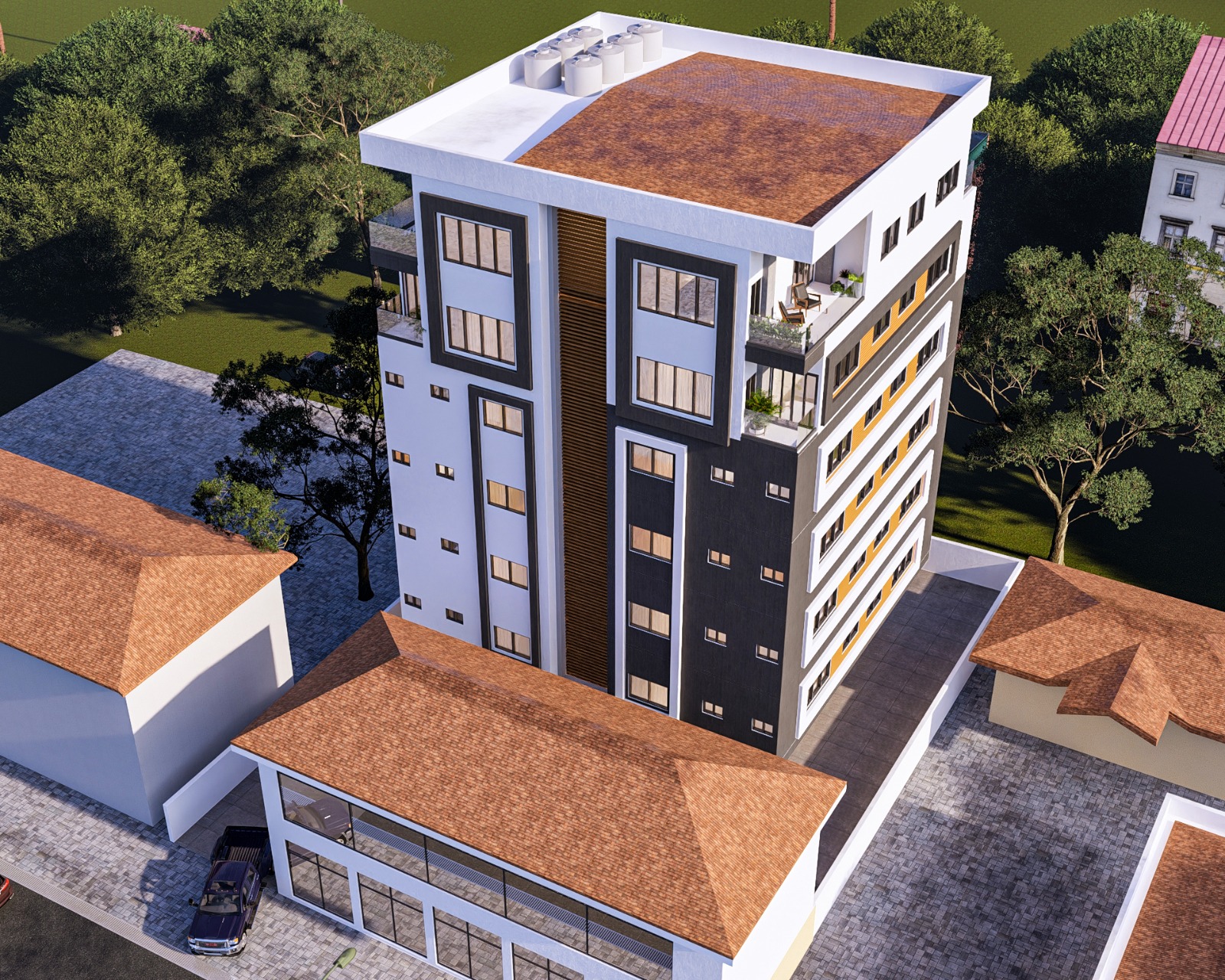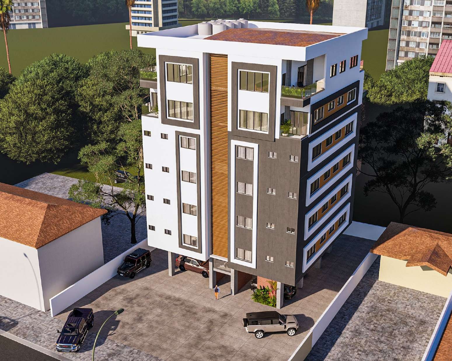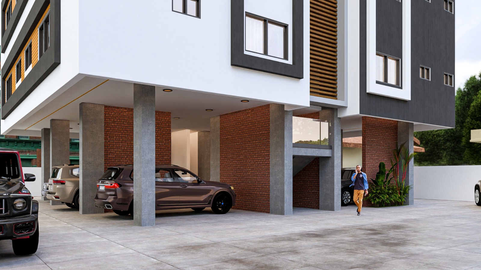 Oxford Towers is a stylish residential building in Osu, Accra. Its modern design features a mix of white and dark grey walls, large windows, and vertical wooden accents. The structure is elevated, with parking beneath, and surrounded by trees and urban scenery, making it ideal for city living.