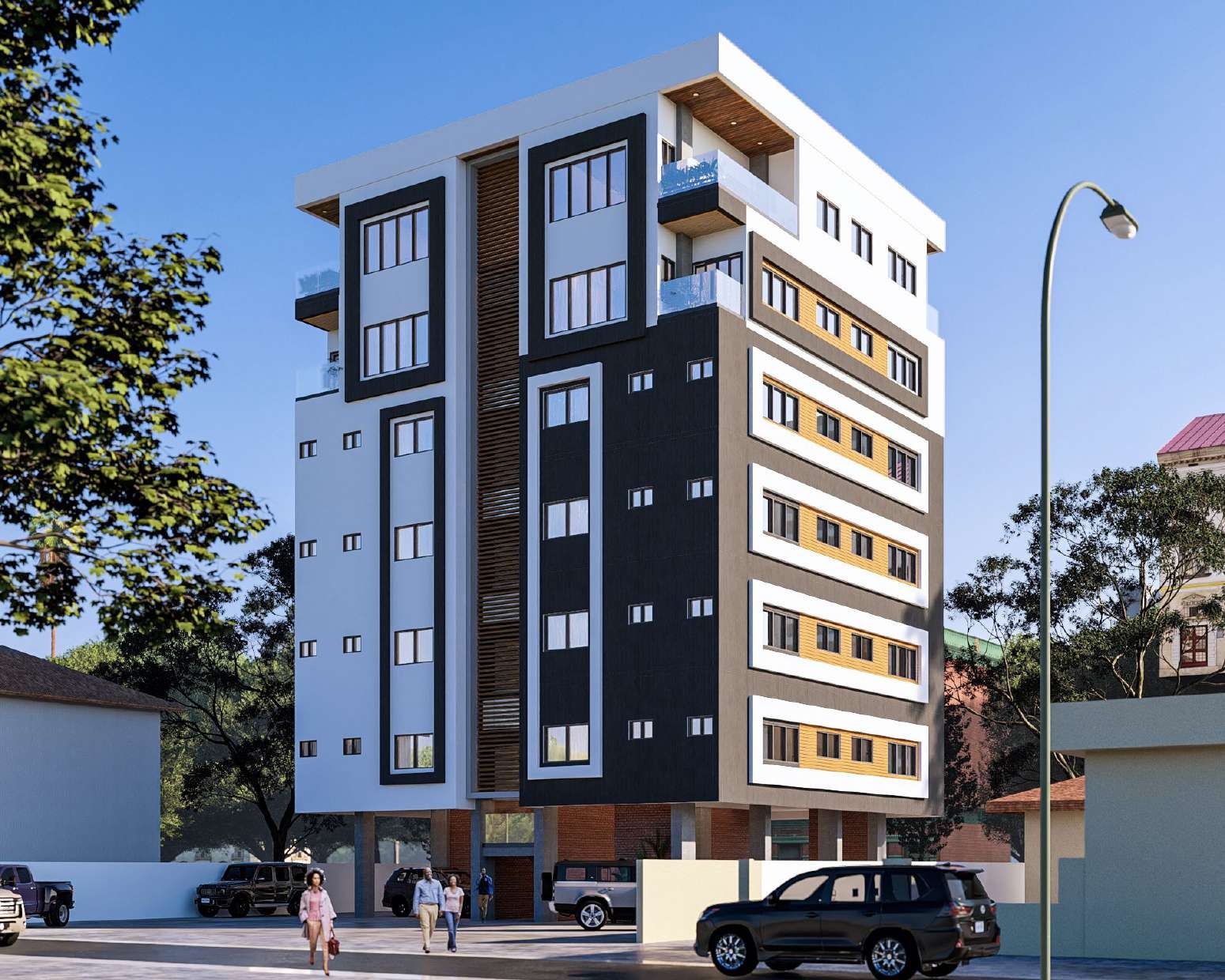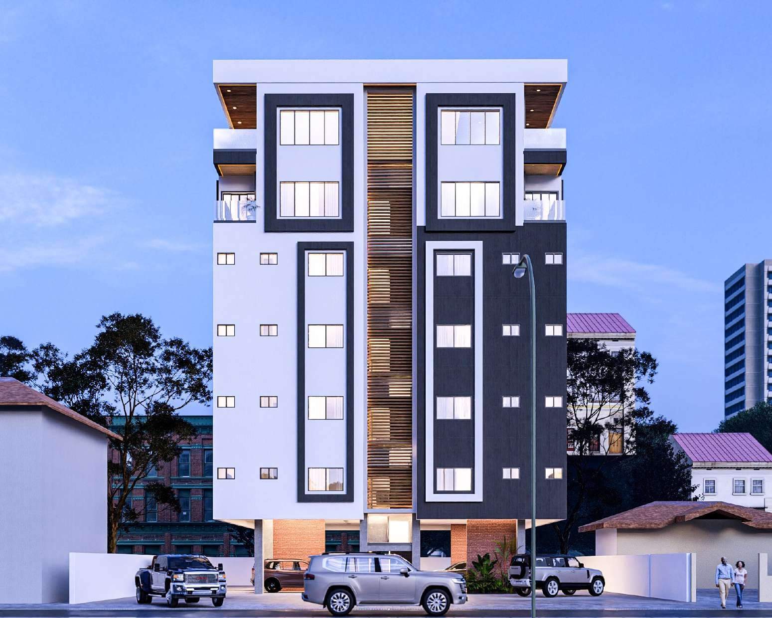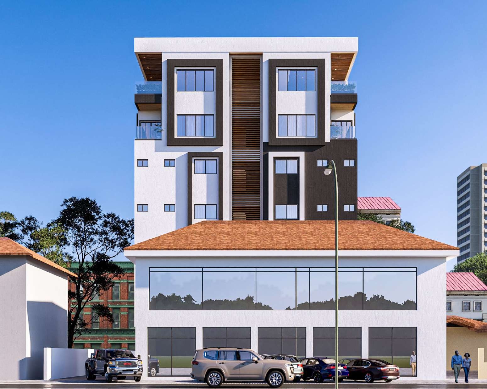 Oxford Towers is a stylish residential building in Osu, Accra. Its modern design features a mix of white and dark grey walls, large windows, and vertical wooden accents. The structure is elevated, with parking beneath, and surrounded by trees and urban scenery, making it ideal for city living.